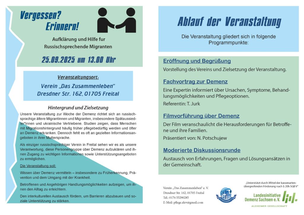 Am 25.09.2025 um 13:00 Uhr findet ein Info-Nachmittag „Vergessen? Erinnern!“ im Verein „Das Zusammenleben“ statt.