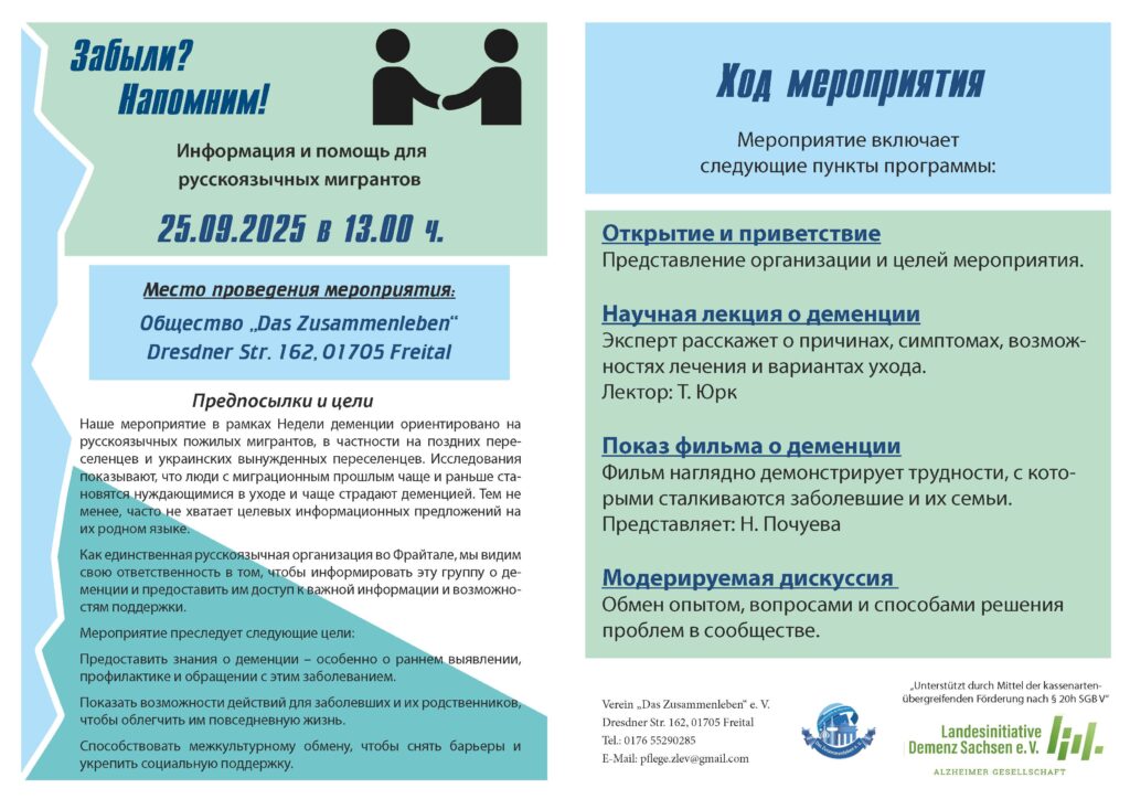 Als einziger russischsprachiger Verein in Freital sehen wir es als unsere Verantwortung, diese Personengruppe über Demenz aufzuklären und ihnen Zugang zu wichtigen Informationen sowie Unterstützungsangeboten zu ermöglichen.